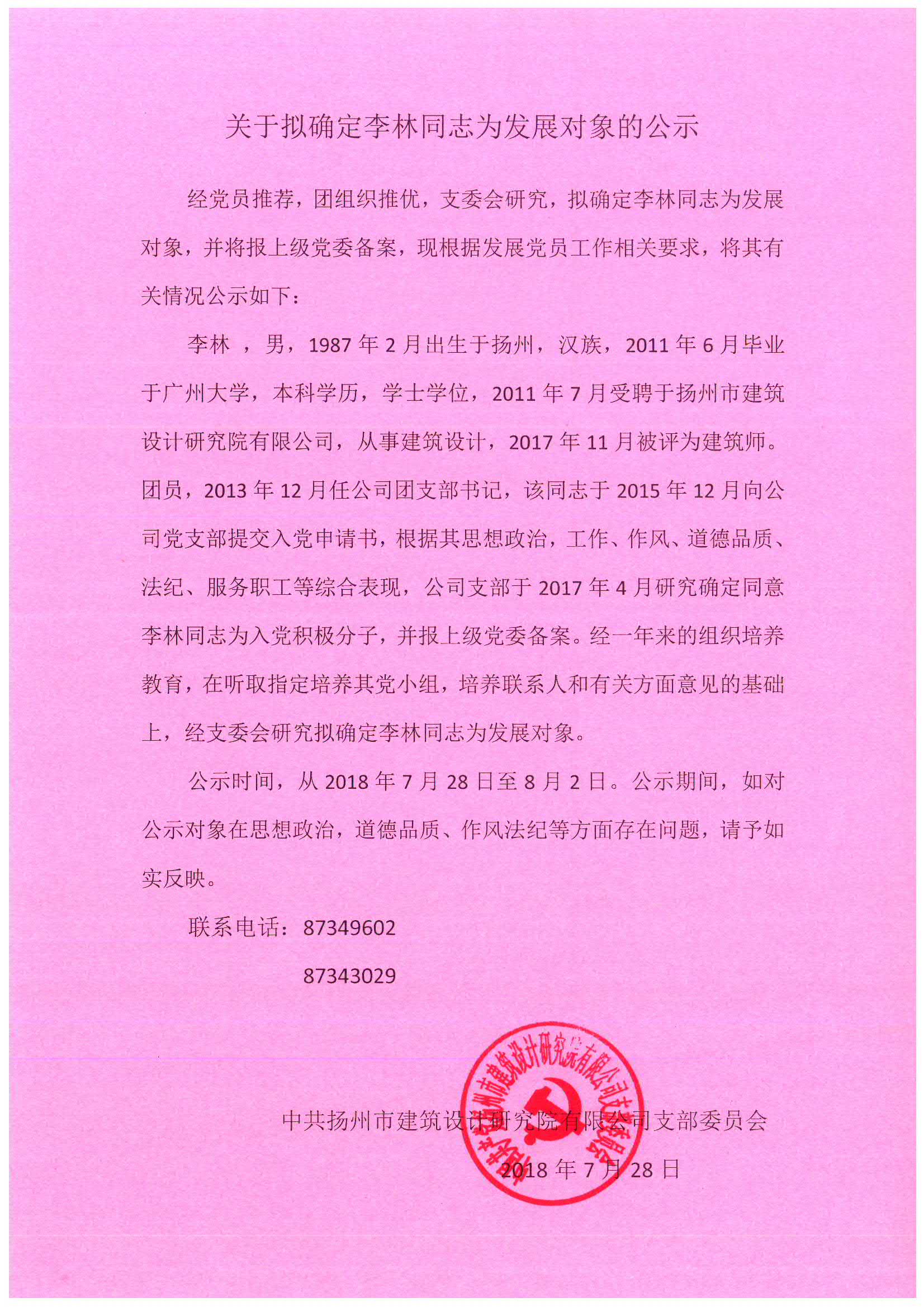 ·關于擬確定李林同志為發展對象的公示 [2018-07-28]